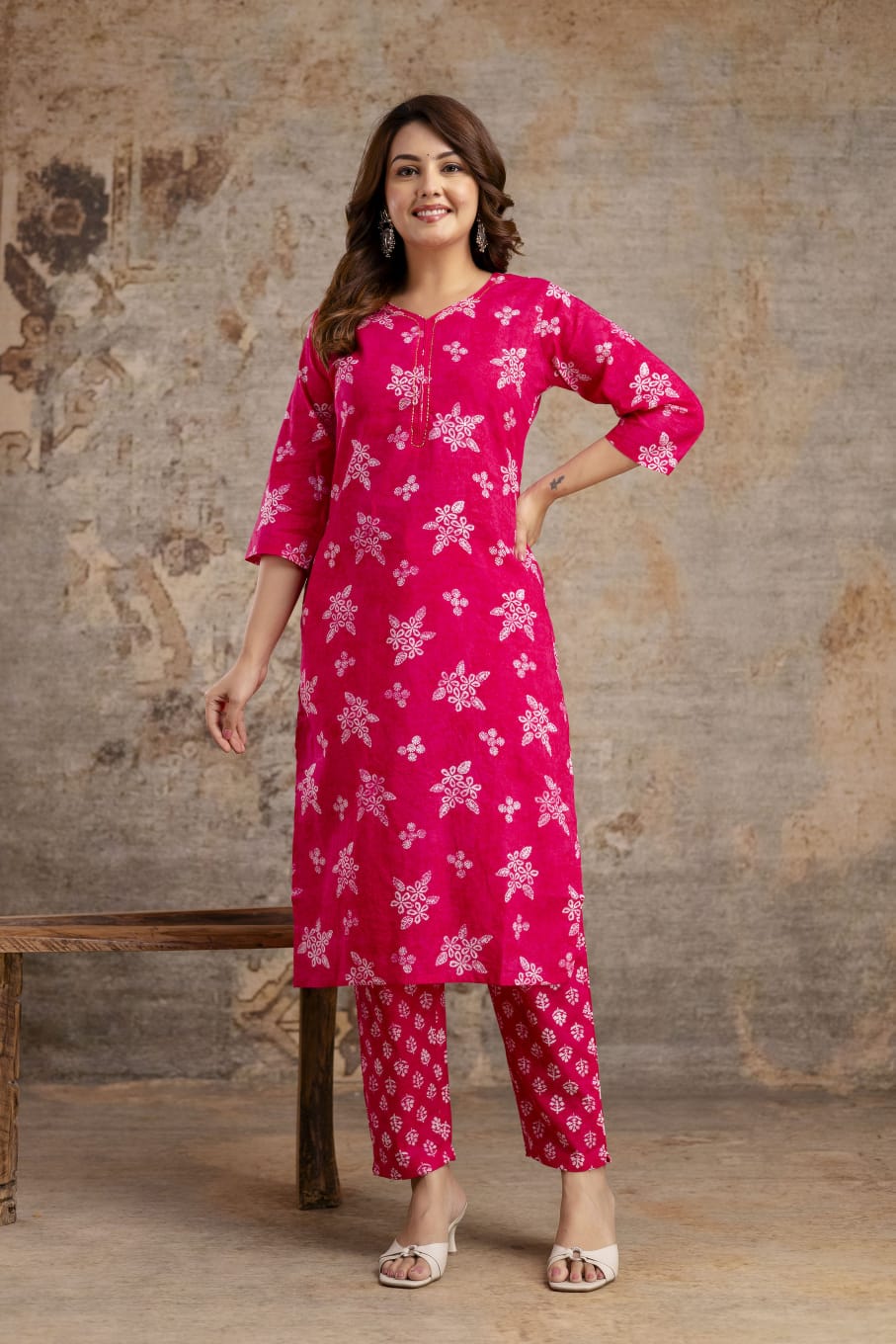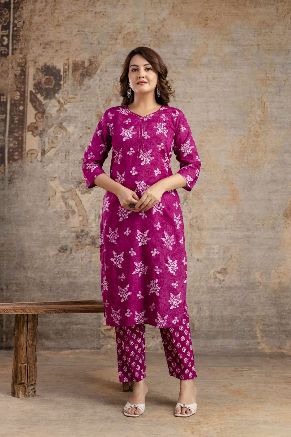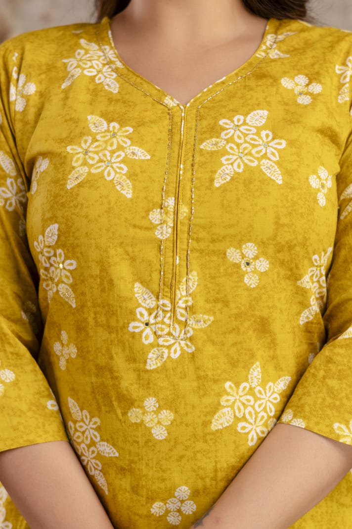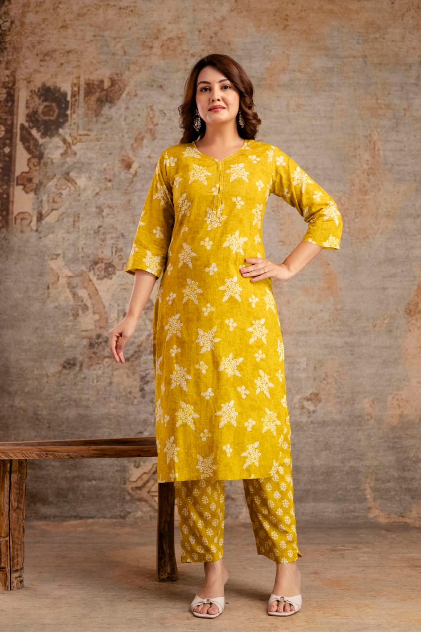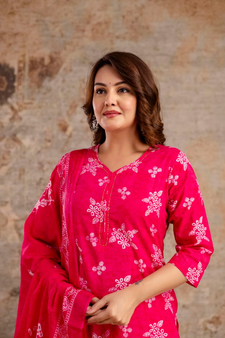 Crafted entirely from soft, high-quality pure cotton, this ensemble offers superior comfort. The straight-fit silhouette is universally flattering, while the delicate floral and geometric print adds a refined touch. The set is complete with printed trousers and a lightweight matching cotton dupatta, allowing for versatile styling. It’s the perfect blend of traditional design and contemporary vibrancy.