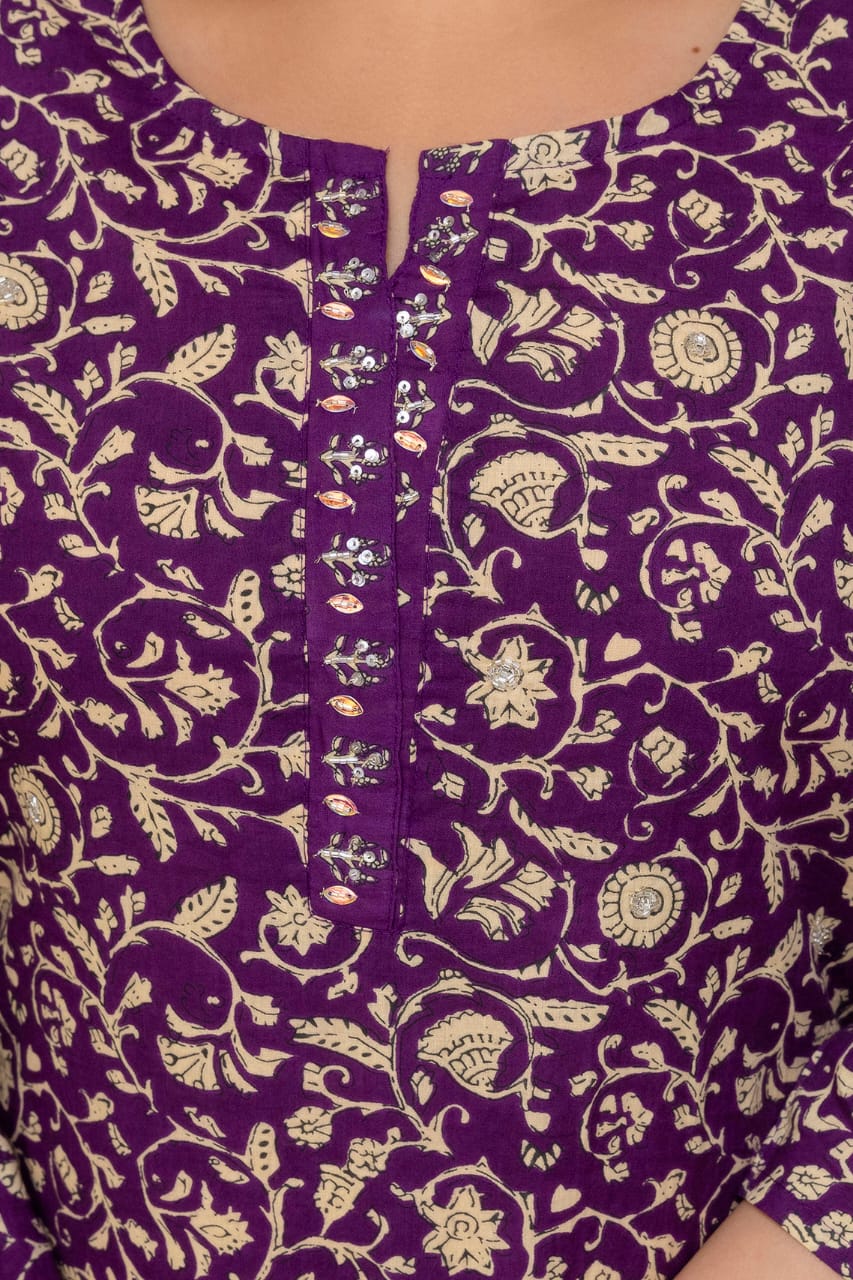 The straight-cut kurta and ankle-length trousers feature a dense, intricate all-over block print in a contrasting golden beige, creating a rich texture. The look is completed by a generous cotton dupatta that perfectly matches the suit and is framed by a beautiful, wide traditional printed border. Ideal for festive occasions, evening gatherings, or adding a touch of sophisticated color to your ethnic wear collection.