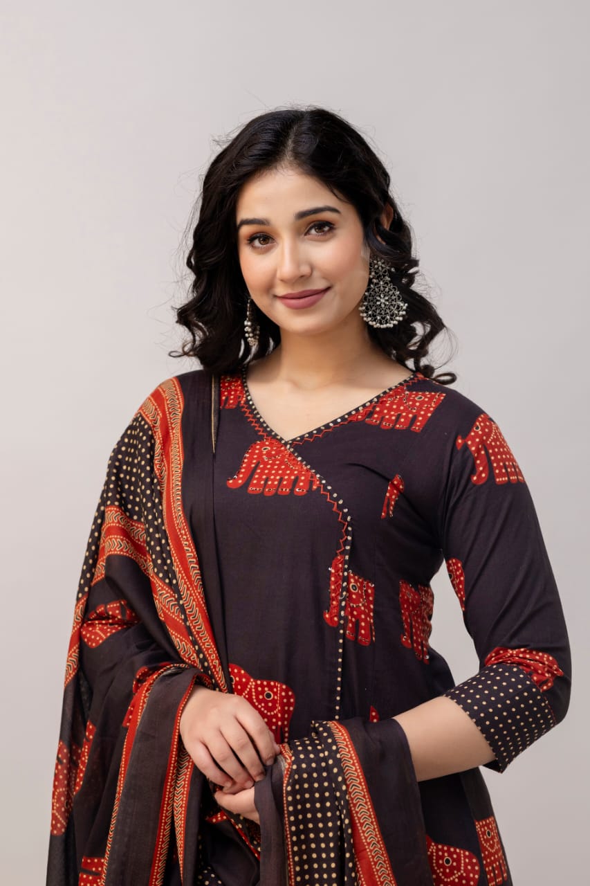 Print: The deep, rich Black/Navy base is adorned with striking crimson red and orange elephant motifs in a traditional block-print style, giving the set a vibrant, cultural appeal.