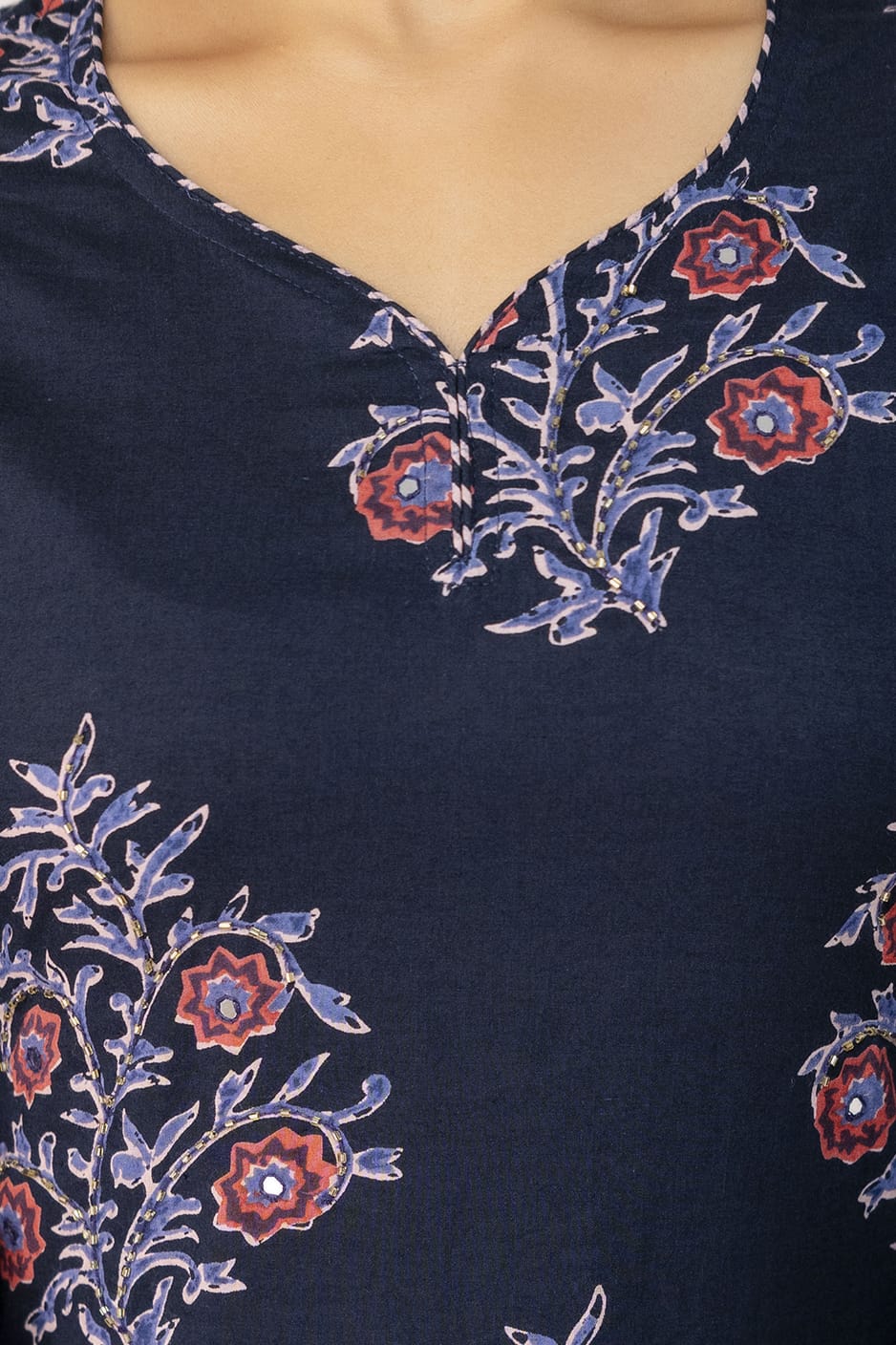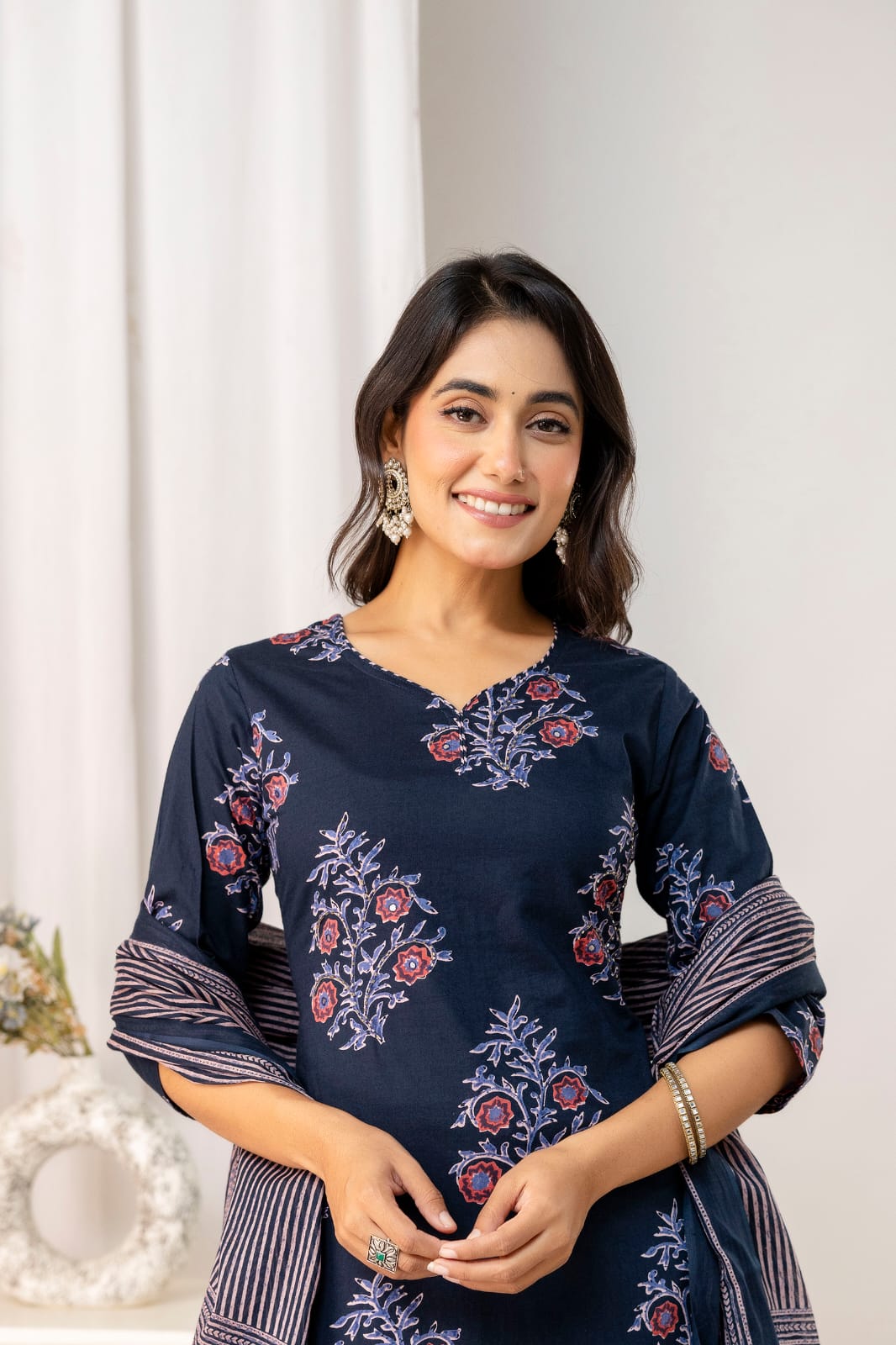 Elevate your ethnic wardrobe with this elegant navy blue cotton suit set, perfect for both casual and festive occasions. The kurta features an all-over floral print in shades of red and lavender, paired beautifully with striped straight-fit pants. The matching striped dupatta with floral border detailing adds a graceful finish to the ensemble. Crafted from breathable cotton fabric, this three-piece set offers comfort and style throughout the day.