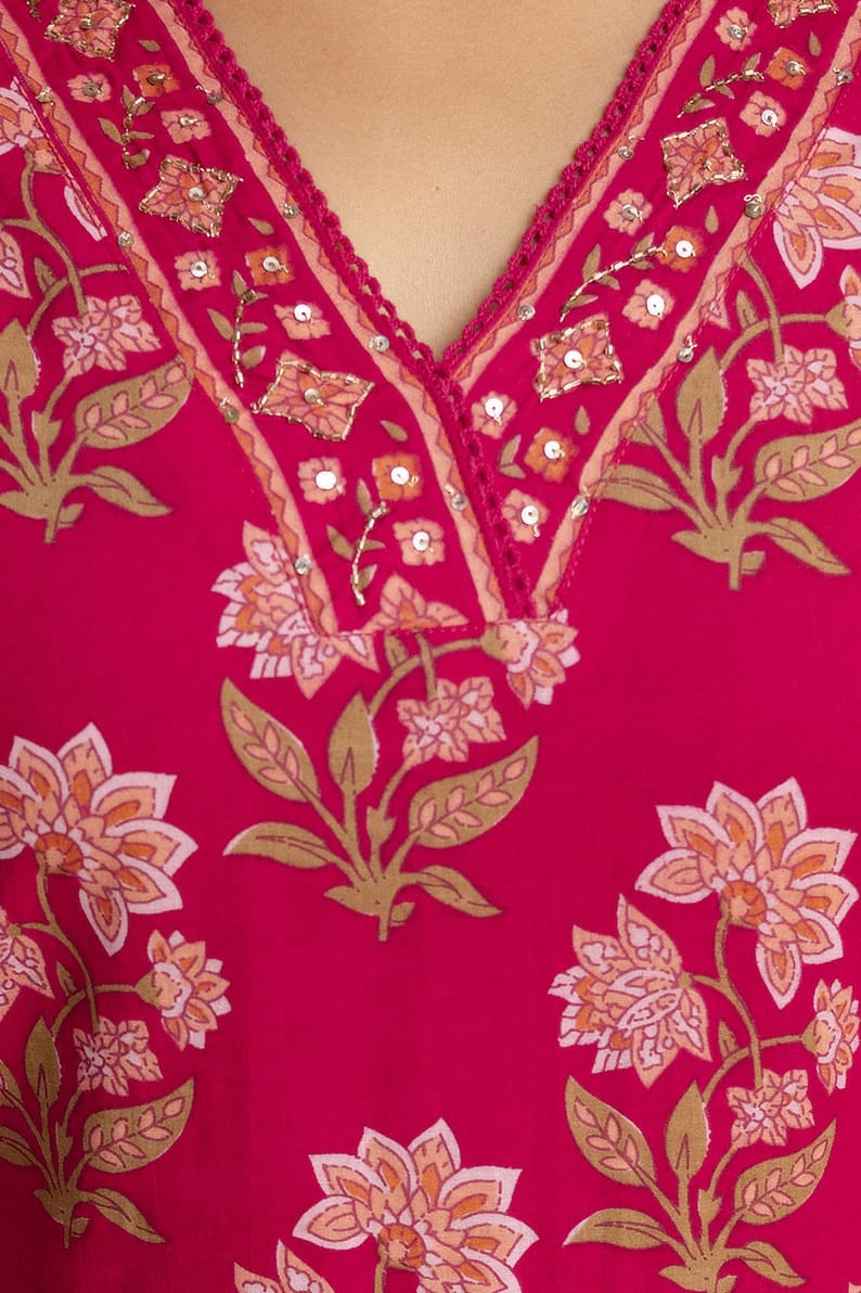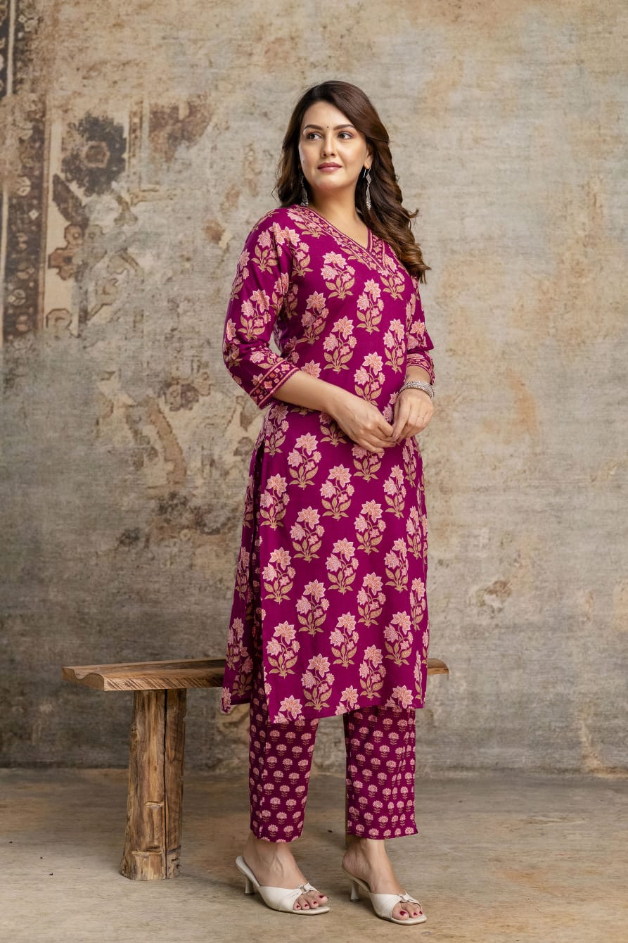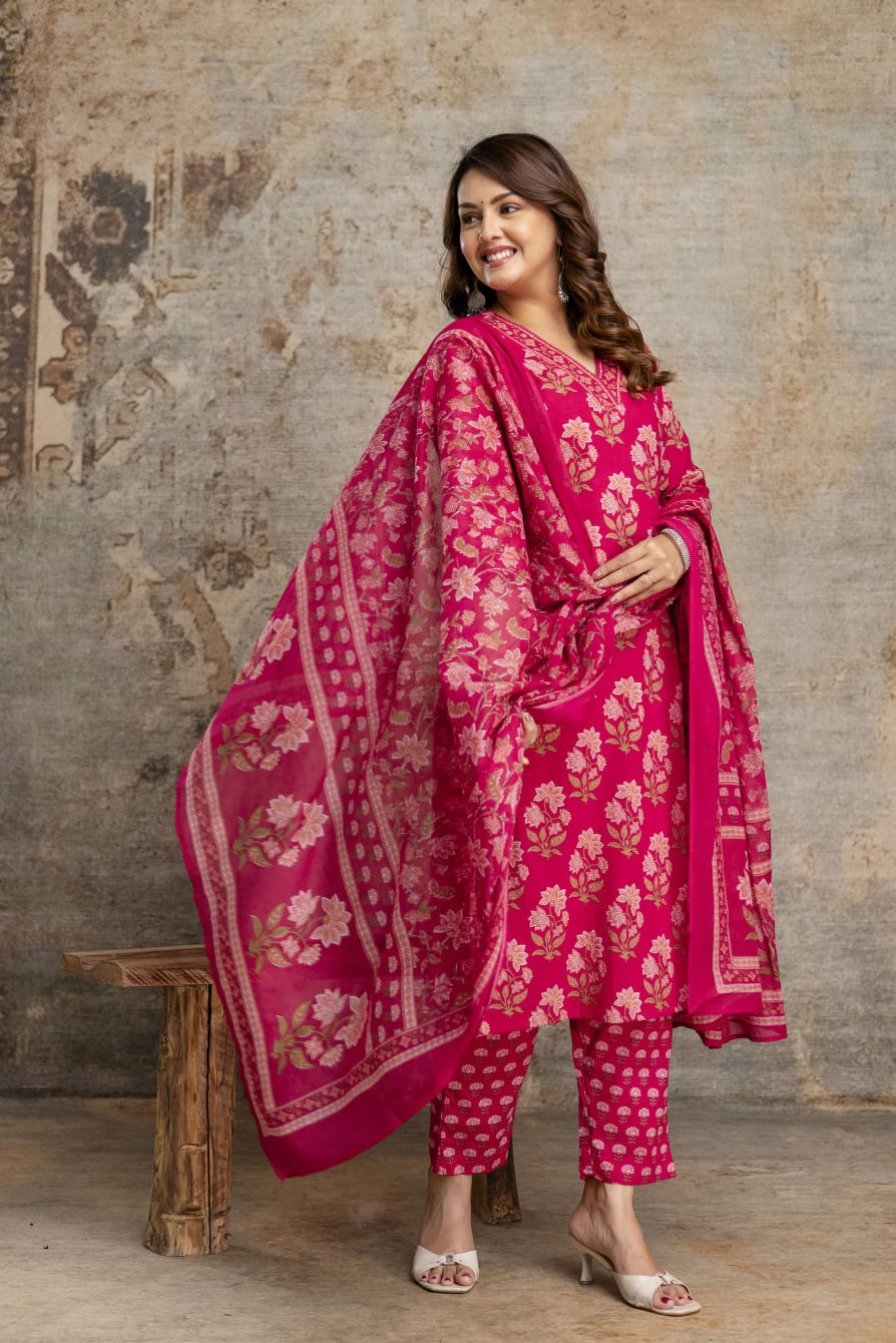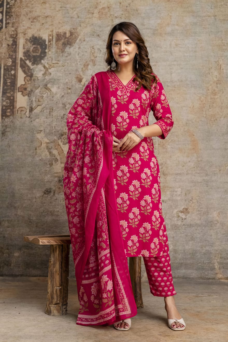 Experience the charm of Rajasthan with this Pink Sanganeri Floral Cotton Suit Set, crafted with traditional handblock motifs that reflect timeless Indian artistry. The kurta features an elegant V-neck and all-over floral print, paired with a matching printed pant for a graceful silhouette. The beautifully coordinated dupatta completes the look, making it a perfect outfit for festive gatherings, family functions, office wear, and elegant casual outings.